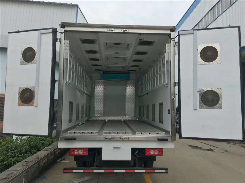 【豬苗車】上裝配置:外玻璃鋼,內(nèi)不銹鋼,兩層液壓升降層板,尾部液壓翻轉(zhuǎn)上豬平臺(tái),層板為不銹鋼骨架鋪鋁花紋板。外部電動(dòng)升降窗,排氣扇,柴油發(fā)電機(jī),暖風(fēng)加熱,喂水系統(tǒng),凈水箱、污水