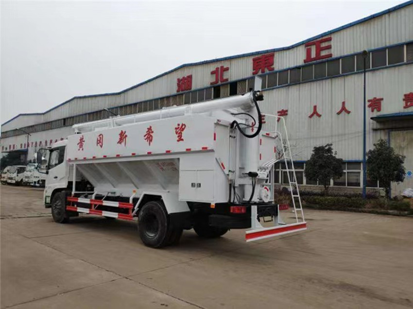 散裝飼料運(yùn)輸車,散裝飼料車的飼料罐架設(shè)在卡車的底盤上,罐頂開有進(jìn)料口.頂部的一根螺旋輸送卸料管(俗稱卸料絞龍)則可自由回轉(zhuǎn)和抬升,抬升的仰角可達(dá)60度。運(yùn)輸時(shí),頂部的螺旋管平臥在罐頂;卸料時(shí)則抬起,使管端的出料口與畜禽飼養(yǎng)場(chǎng)貯料罐頂部的進(jìn)料門相接,駕駛室內(nèi)裝有操縱裝置(操縱裝置也可裝置在罐體尾部),卸料時(shí)通過車底的動(dòng)力輸出軸和減速器來驅(qū)動(dòng)螺旋,以完成卸料。