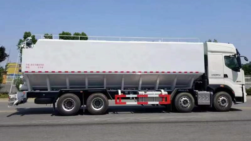 散裝飼料運輸車,散裝飼料車的飼料罐架設(shè)在卡車的底盤上,罐頂開有進(jìn)料口.頂部的一根螺旋輸送卸料管(俗稱卸料絞龍)則可自由回轉(zhuǎn)和抬升,抬升的仰角可達(dá)60度。運輸時,頂部的螺旋管平臥在罐頂;卸料時則抬起,使管端的出料口與畜禽飼養(yǎng)場貯料罐頂部的進(jìn)料門相接,駕駛室內(nèi)裝有操縱裝置(操縱裝置也可裝置在罐體尾部),卸料時通過車底的動力輸出軸和減速器來驅(qū)動螺旋,以完成卸料。