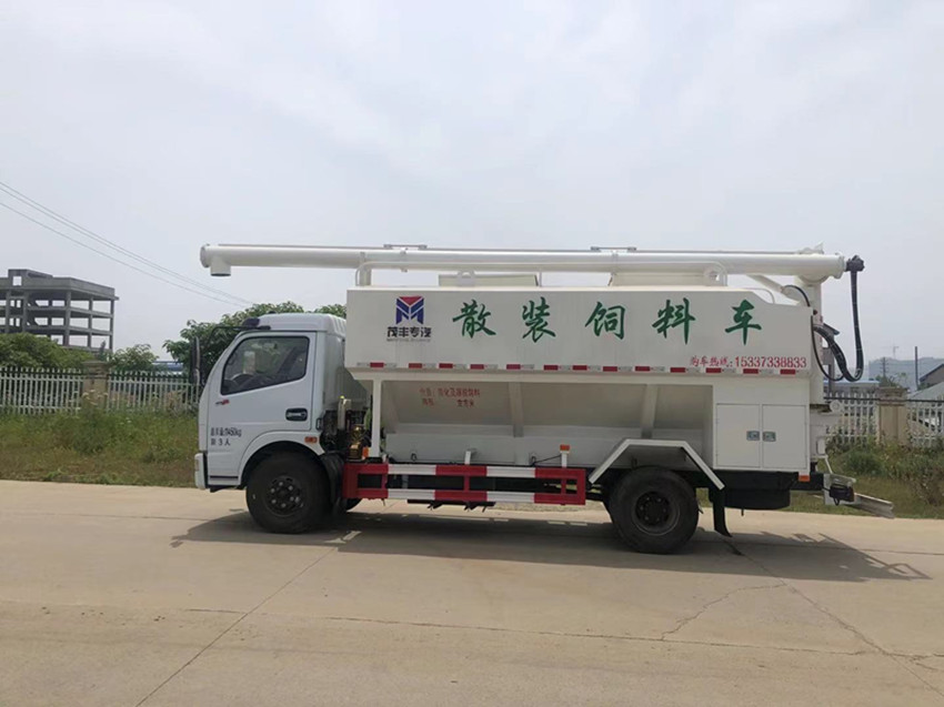 散裝飼料運(yùn)輸車,散裝飼料車的飼料罐架設(shè)在卡車的底盤上,罐頂開有進(jìn)料口.頂部的一根螺旋輸送卸料管(俗稱卸料絞龍)則可自由回轉(zhuǎn)和抬升,抬升的仰角可達(dá)60度。運(yùn)輸時(shí),頂部的螺旋管平臥在罐頂;卸料時(shí)則抬起,使管端的出料口與畜禽飼養(yǎng)場貯料罐頂部的進(jìn)料門相接,駕駛室內(nèi)裝有操縱裝置(操縱裝置也可裝置在罐體尾部),卸料時(shí)通過車底的動(dòng)力輸出軸和減速器來驅(qū)動(dòng)螺旋,以完成卸料。